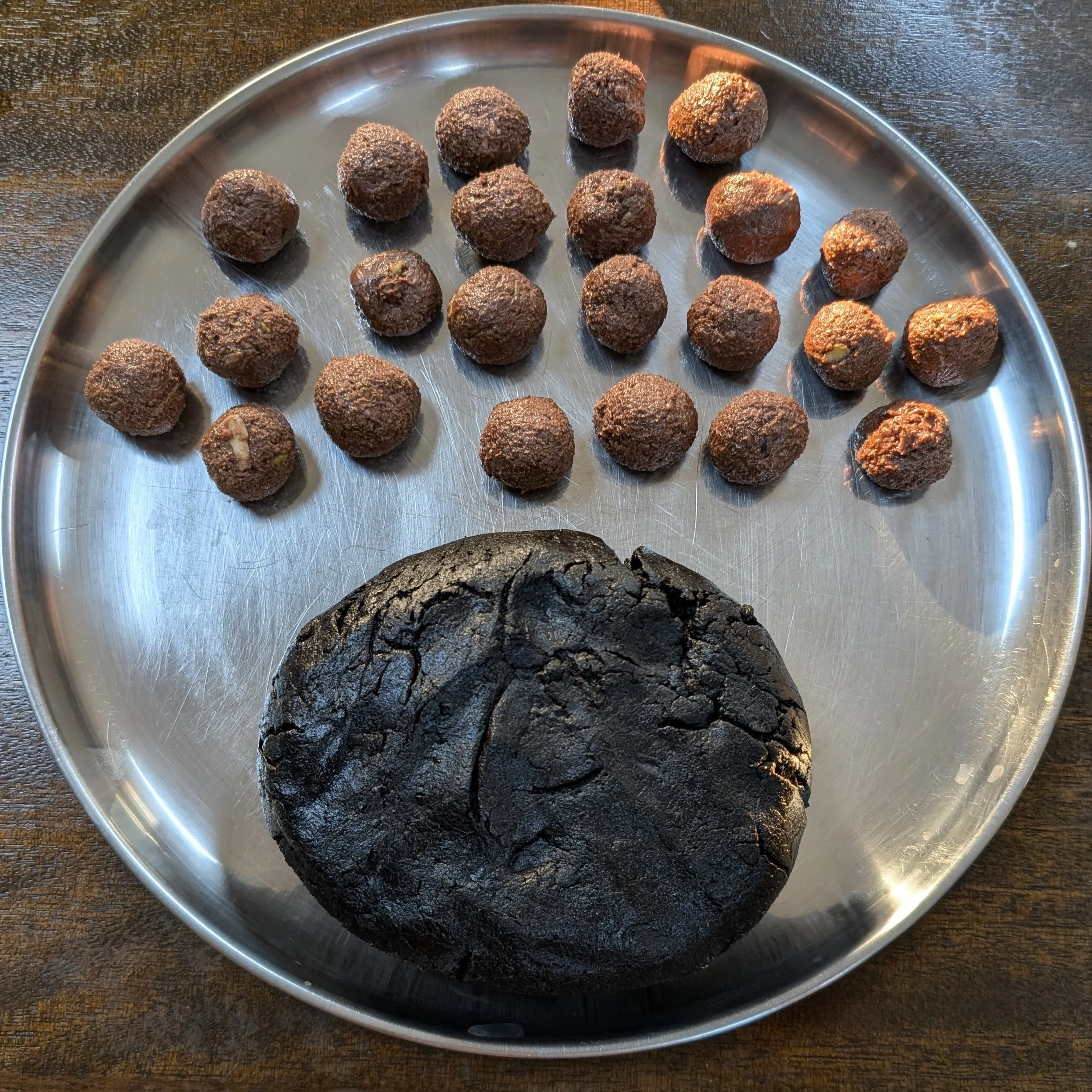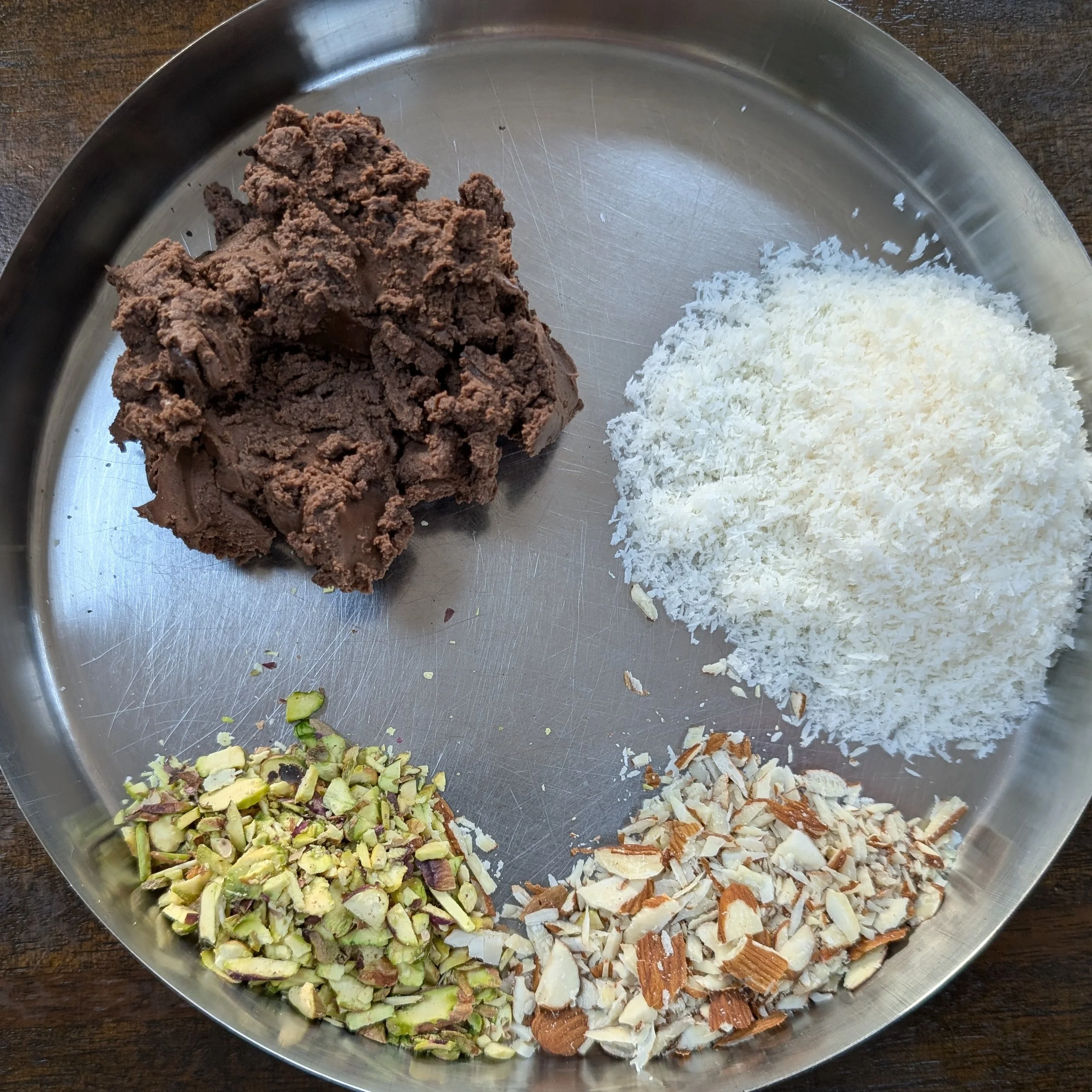 To make the filling in the chocolate cream add the chopped nuts and coconut and mix well. Then make equal size balls of it.
