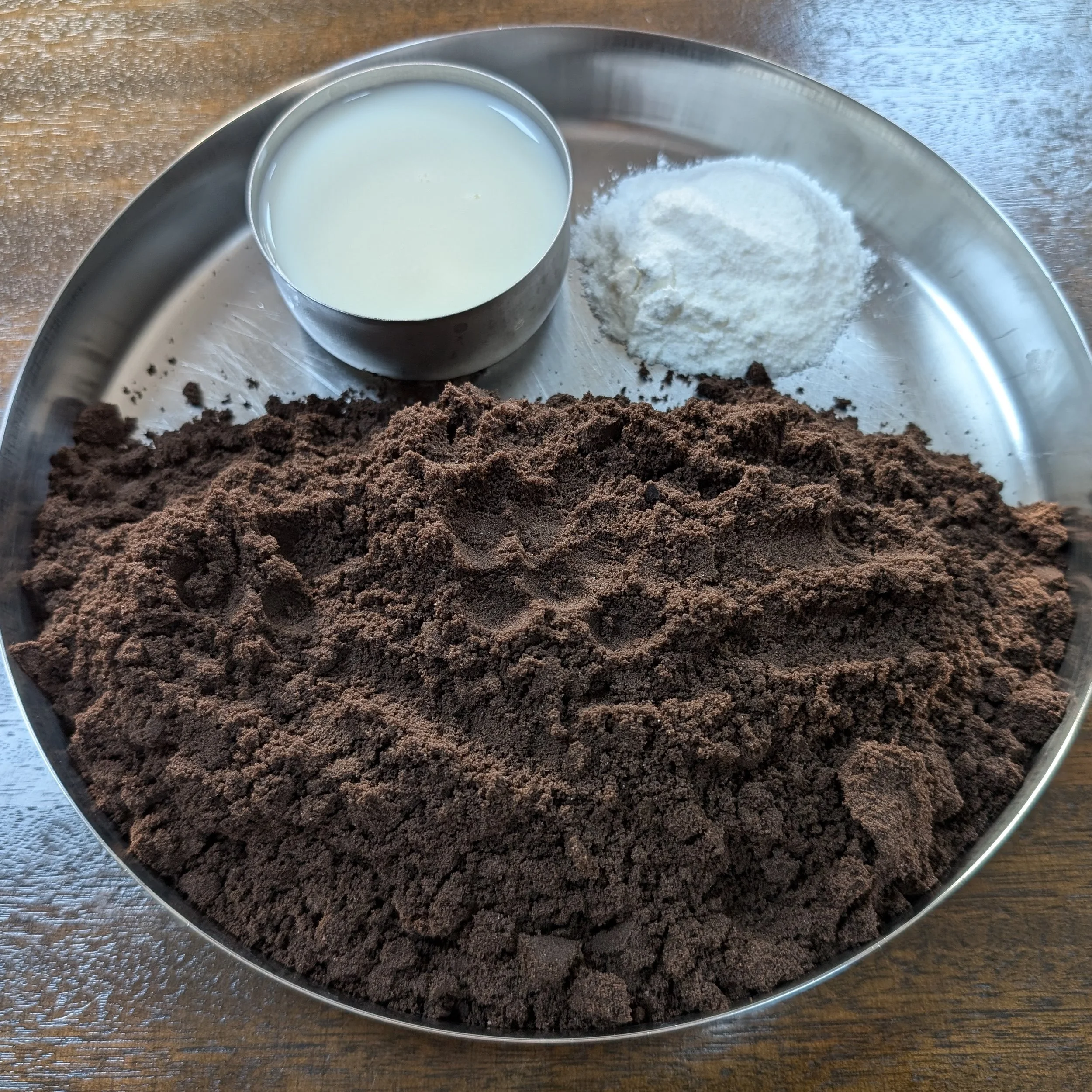 Remove the biscuit powder in a bowl and mix the powder sugar in it. Add milk little by little to make a semi soft dough. Cover and keep for future use.
