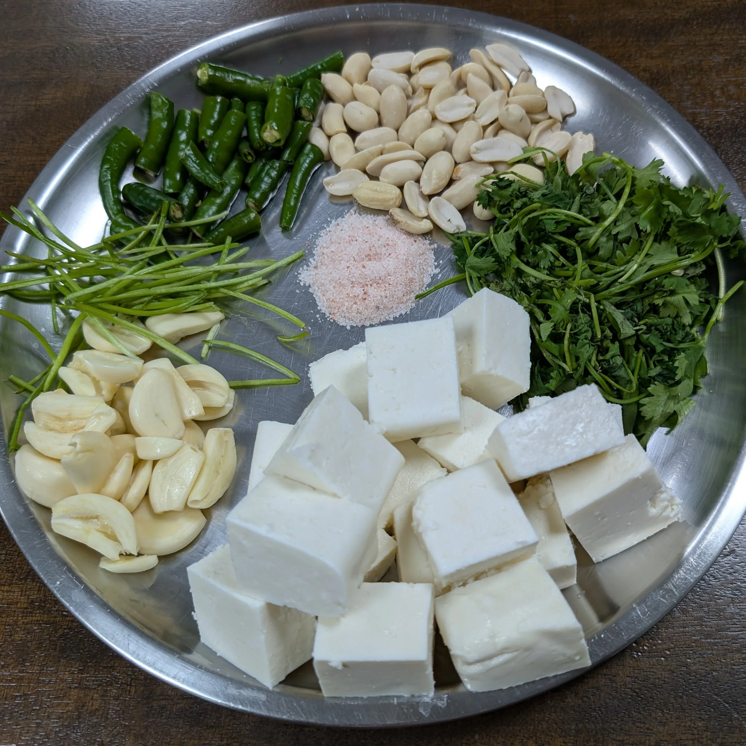 In a pan heat 1 tsp oil and roast the peanuts for a minute on low flame then add the garlic, green chillies and again saute for half a second . Remove and allow them to cool.