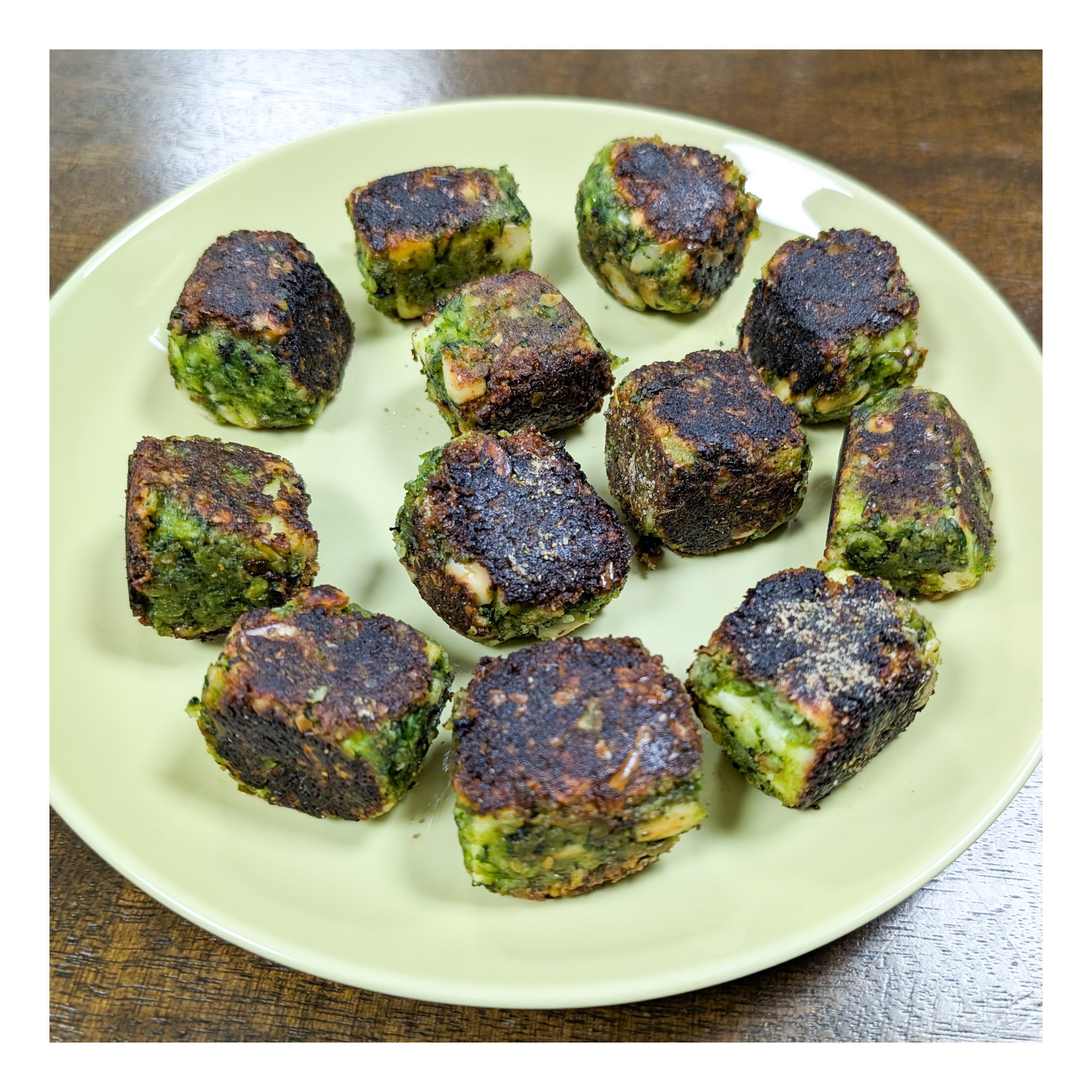 In a non stick pan heat 3-4 tbsp oil then place one by one the paneer cubes on it and cook on low flame on all the sides till golden brown in colour.